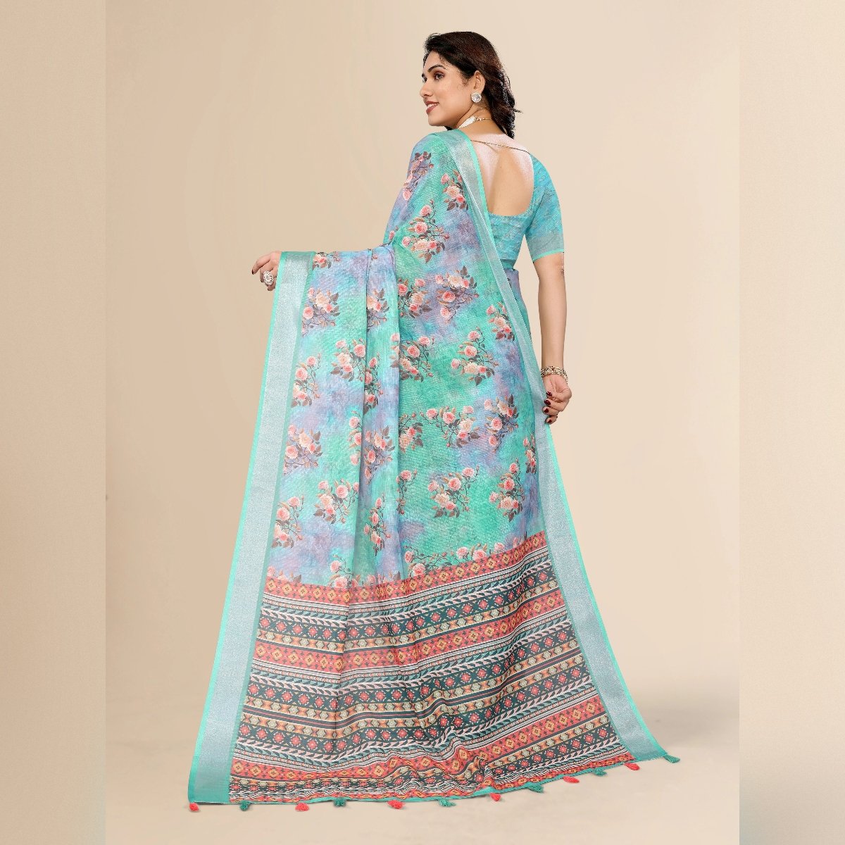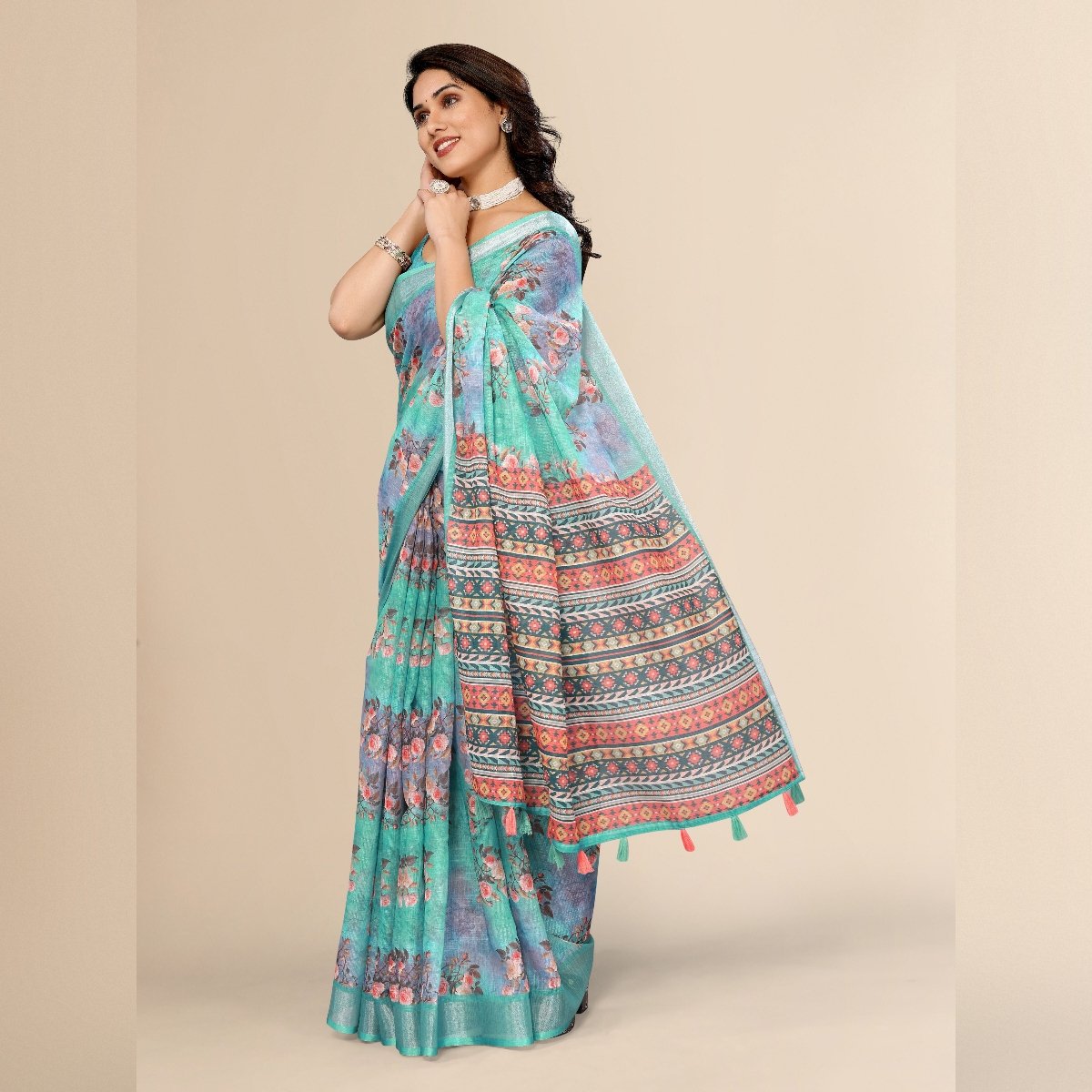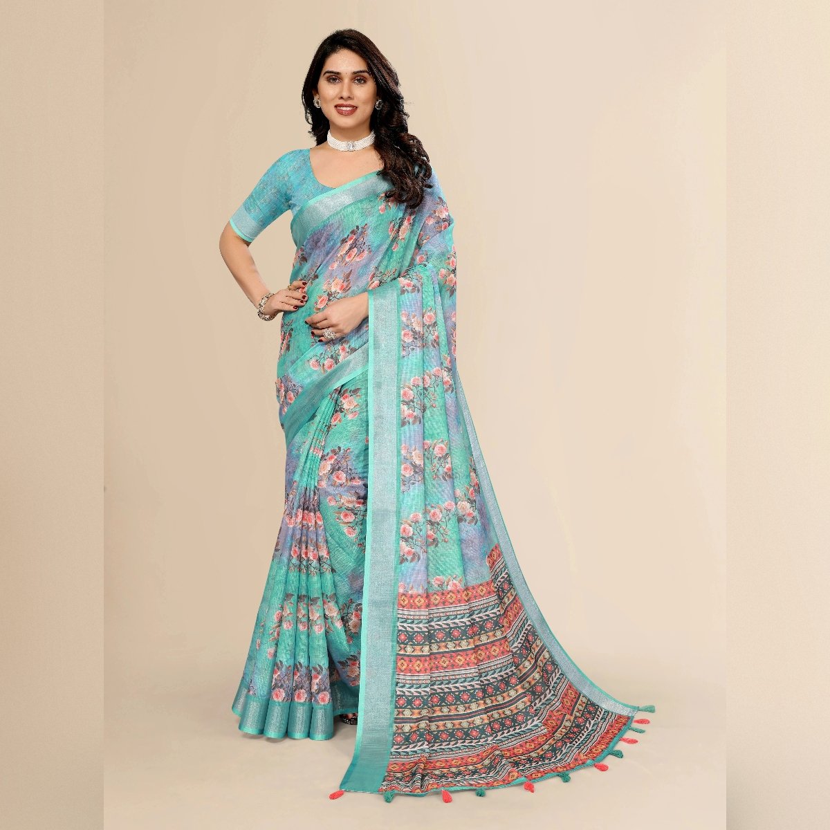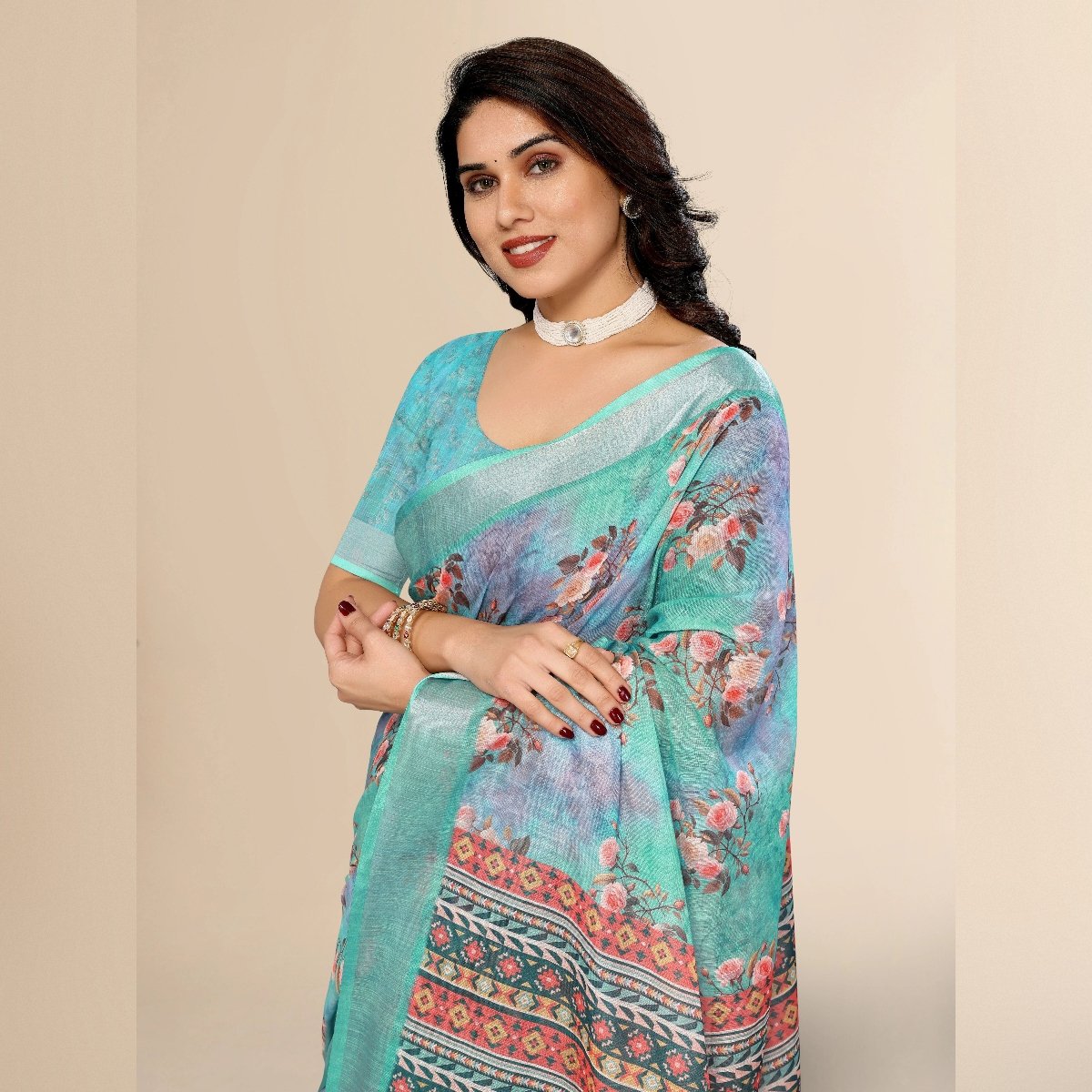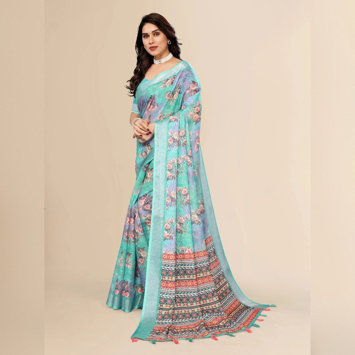 Elegance of traditional Indian attire with our exquisite Ethnic Cotton Linen Printed Saree. This saree beautifully blends the comfort of cotton with the luxurious texture of linen, making it an ideal choice for various occasions, whether it’s a casual day out, a festive celebration, or a cultural event. The fabric’s lightweight and breathable nature ensures all-day comfort, especially in warm climates, while its slightly textured weave adds a sophisticated touch to your ensemble.